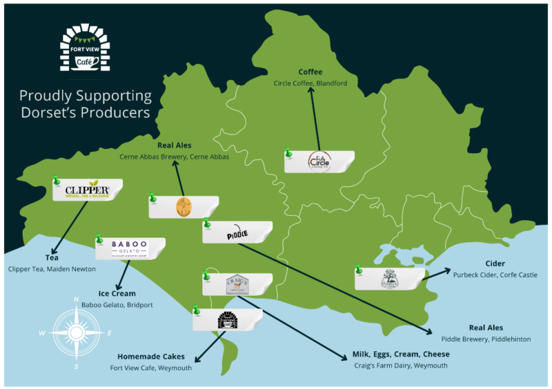 Each day, Fort View Café serves a delicious selection of freshly made hot and cold snacks, with cakes and scones made daily on site, using fresh and locally sourced produce. We are so lucky in Dorset to work with many wonderful local suppliers, including Baboo Gelato Ice Cream, Clipper Tea, Full Circle Coffee and locally made scones and cakes and baked goods.